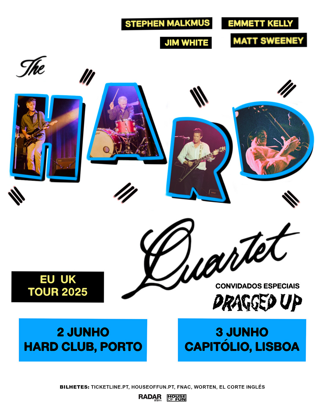 Já estão à venda os bilhetes espetáculos de THE HARD QUARTET em Portugal, o supergrupo de indie rock de STEPHEN MALKMUS, MATT SWEENEY, EMMETT KELLY e JIM WHITE, que atua em Portugal no próximo mês de junho. O coletivo apresentar-se-á ao vivo no HARD CLUB